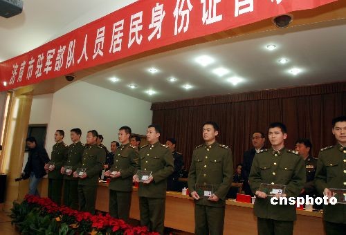 2009年2月26日,濟南警備區(qū)、濟南市公安局聯(lián)合舉行駐濟部隊現(xiàn)役軍人居民身份證首發(fā)儀式。自此,濟南市為駐濟部隊申領(lǐng)發(fā)放具名身份證工作正式啟動。此舉將對部隊人員辦理儲蓄、保險、買車、購房等涉及個人權(quán)益事物時帶來便捷。中新社發(fā) 龔輝 攝