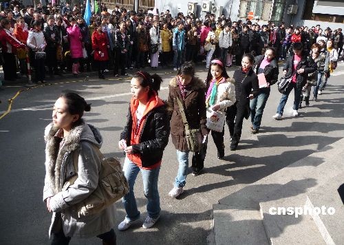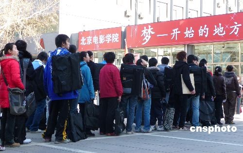 2009年2月7日,北京電影學(xué)院2009年招生初試工作已進入了第三天,一批批來自全國各地的考生繼續(xù)為圓明星夢而拼搏努力。今年最顯著的特點是本色考生越來越多,濃妝艷抹、奇裝異服的考生少了。據(jù)悉,表演專業(yè)一直被認為是北影“最難考的專業(yè)”,雖然今年的招生人數(shù)由往年的30人增加到75人,但面對4234名報考者,淘汰率仍高達98.2%。一位考官告訴記者,雖然報名者很多,但有充分準備、專業(yè)水平較高的考生不超過千人,還是有很多考生很盲目。中新社發(fā) 玉龍 攝