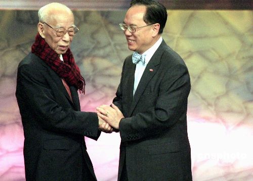 四月二十一日,香港特區(qū)行政長(zhǎng)官曾蔭權(quán)為最高榮譽(yù)“終身成就獎(jiǎng)”得主國(guó)學(xué)大師兼漢學(xué)家饒宗頤教授頒獎(jiǎng)祝賀。當(dāng)日,“2008香港藝術(shù)發(fā)展獎(jiǎng)”頒獎(jiǎng)禮在香港大會(huì)堂舉行,頒發(fā)了三十一個(gè)獎(jiǎng)項(xiàng)予本地藝術(shù)工作者、團(tuán)體、學(xué)校及商業(yè)機(jī)構(gòu),以表?yè)P(yáng)他們?cè)谒囆g(shù)方面的成就。中新社發(fā) 張勤 攝
