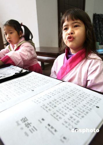 4月25日,生活在北京的中歐混血兒莊潤(rùn)盈身著漢服,在國(guó)子監(jiān)國(guó)學(xué)館學(xué)堂誦讀傳統(tǒng)精典《三字經(jīng)》。近年來(lái),國(guó)學(xué)已呈現(xiàn)出越來(lái)越熱的趨勢(shì),中外人士煥發(fā)出對(duì)中國(guó)傳統(tǒng)文明價(jià)值的認(rèn)同。中新社發(fā) 張宇 攝