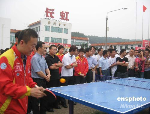 9月20日,中國體育總局乒羽中心主任劉鳳巖、男乒主教練劉國梁、女乒主教練施之皓、隊員張怡寧、馬琳、王皓、王勵勤等一行15人帶著奧運金牌、榮譽(yù)、喜悅和祝福,前往四川綿陽長虹培訓(xùn)中心看望慰問在汶川大地震中遭受重創(chuàng)的北川中學(xué)學(xué)生。圖為馬琳等隊員與學(xué)生們切磋球技。中新社發(fā) 肖青 攝