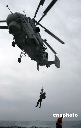 2009年元旦,中國海軍護(hù)航艦艇編隊(duì)正在印度洋航行,圖為“海口”艦航行途中開展艦機(jī)與隨艦特戰(zhàn)隊(duì)員的協(xié)同訓(xùn)練。中新社發(fā) 孫自法 攝