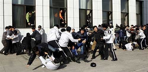 1月3日,在韓國首都首爾,警察(穿灰白色上衣者)阻止反對黨成員爬窗進入國會。韓國主要反對黨民主黨議員自2008年12月26日起占據(jù)了國會大會議廳內的議長座位,以阻止執(zhí)政的大國家黨單方面通過一系列有爭議法案。