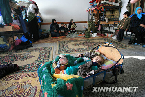 1月3日,在加沙地帶南部拉法,很多巴勒斯坦難民臨時(shí)寄居在一個(gè)難民營的學(xué)校里。以色列對(duì)加沙的空襲已造成約470人死亡、2400人受傷。許多巴勒斯坦人家園被毀,流離失所。 新聞圖集:以軍開始發(fā)動(dòng)地面進(jìn)攻
