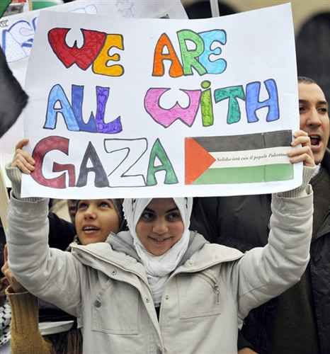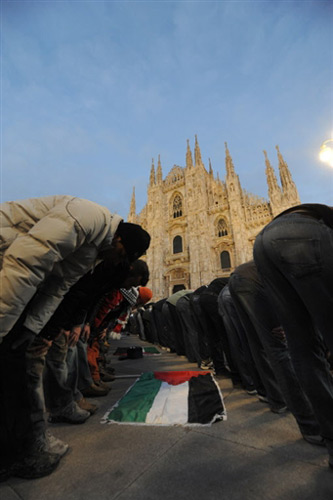 1月3日,在意大利米蘭,當(dāng)?shù)厝罕娕e行集會活動,對在加沙地區(qū)遭空襲的巴勒斯坦死難者進行祈禱,抗議以色列襲擊加沙。