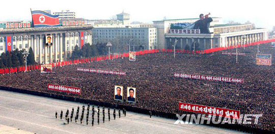 平壤群眾在金日成廣場(chǎng)舉行集會(huì),表示響應(yīng)千里馬綜合煉鋼企業(yè)不久前發(fā)出的“掀起新的革命高潮”運(yùn)動(dòng)的號(hào)召。
