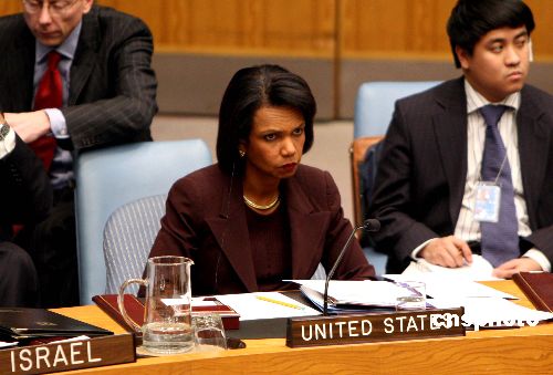 聯(lián)合國安理會一月六日晚就加沙局勢舉行緊急會議。美國國務卿賴斯出席會議。中新社發(fā) 李靜 攝