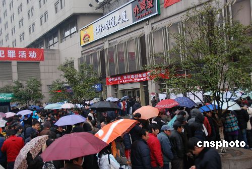 1月7日,在杭州城站火車站的售票大廳門前,排隊(duì)購票的人群異常擁擠。由于細(xì)雨綿綿的天氣,使得大廳外排起了雨傘購票的長龍。中新社發(fā) 張潔 攝