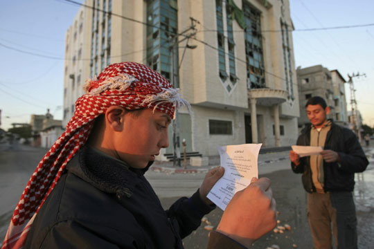 圖為當(dāng)?shù)鼐用裾陂喿x以色列投發(fā)的傳單。