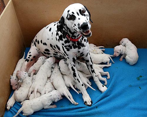 圖:英國斑點狗一次產(chǎn)下18只小狗