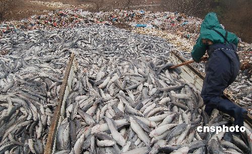 據(jù)工人王中友介紹,1月5日凌晨6時,按常規(guī)尋塘?xí)r,發(fā)現(xiàn)每個魚池內(nèi)的鯰魚全部沉入了水底。中午11時左右,沉入水底的鯰魚一個個漂在水面,大片死魚漂滿了魚池,死亡數(shù)占95%以上。從1月5日中午開始,汪功兵組織近20人將死魚從魚池中撈上,用兩臺汽車向外裝運(yùn)。目前每天只能處理5萬斤死魚,大概需要一周時間才能清理完畢。