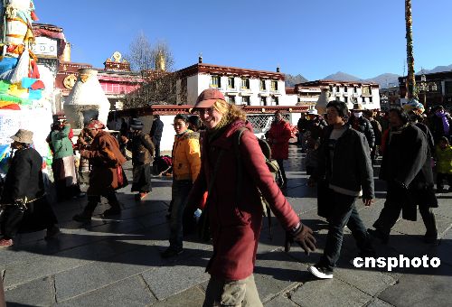 圖:外國游客愉悅游覽拉薩大昭寺廣場(chǎng)
