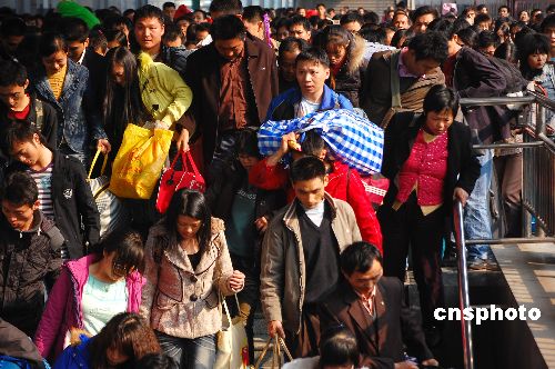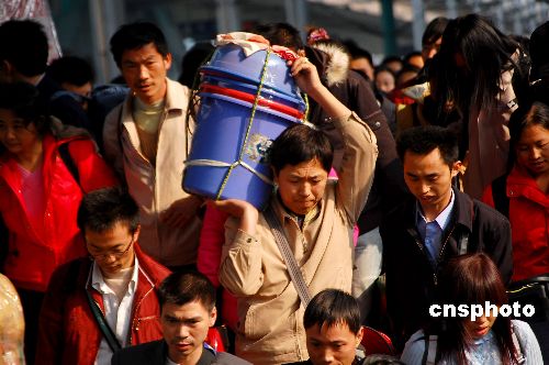 2009年1月10日,重慶北火車站迎來第一波春運客流高峰。由于外出務工人員提前返鄉(xiāng),各大高校開始放假,民工流和學生流融合,重慶火車站在春運前夕迎來了首個客流高峰,重慶市各大汽車站、火車站當日都增開了加班車和臨客。2009年全國春運從1月11日開始,到2月19日結束,共計40天。中新社發(fā) 許康平 攝