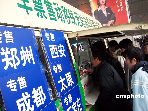 2009年1月10日,旅客在南京市一輛流動(dòng)售票車前排隊(duì)購買春運(yùn)汽車票。春運(yùn)來臨,江蘇省南京市交通運(yùn)輸部門在車站廣場和市區(qū)繁華路段設(shè)立了流動(dòng)售票車,既緩解了車站集中售票的人流壓力,又使旅客體驗(yàn)到了春運(yùn)購票的便捷。中新社發(fā) 王啟明 攝