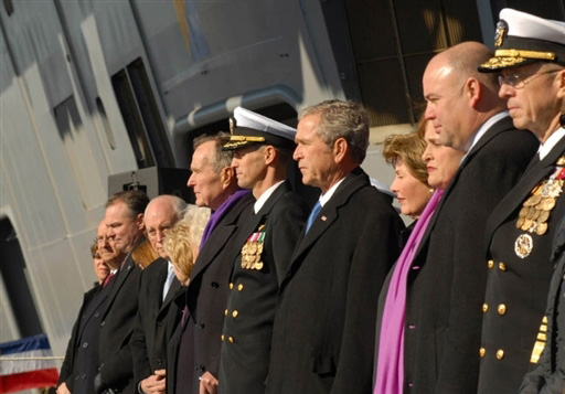 美國(guó)總統(tǒng)布什與親近家人及高層官員,參加核子動(dòng)力航空母艦“布什號(hào)”(USS George H.W. Bush)下水服役儀式。