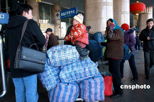 1月11日,為期40天的中國2009年春運正式開始,春運客流壓力依然很大,客流的剛性需求特征十分明顯,預(yù)計全國鐵路旅客發(fā)送量將達1.88億人,比去年同期增長8%,日均470萬人,春運“一票難求”的問題仍突出。圖為北京西站的客流不斷。