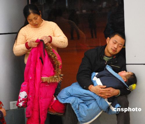 父女已經(jīng)在等待中睡著了。中新社發(fā) 許康平 攝