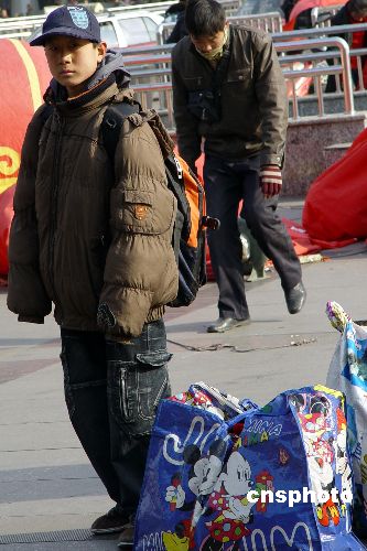 圖為鄭州火車站廣場前一位不足16歲的“小小農(nóng)民工”。中新社發(fā) 李志全 攝