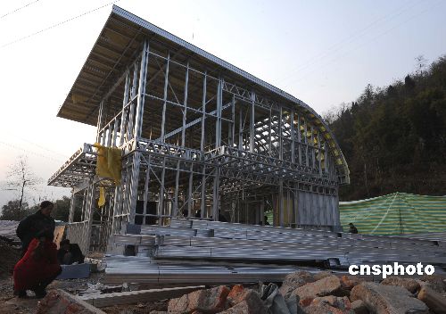 一座被四川災民稱為“最牛的抗震房”春節(jié)前夕在地震受災最重的北川縣永安鎮(zhèn)路邊崛起。這座由新加坡和成都合資公司建起的樣板房,采用新西蘭技術(shù),電腦設(shè)計,國產(chǎn)合金材料和抗壓裂建材,三室一廳兩層式,同類房屋已經(jīng)在泰國、伊朗和印尼災區(qū)重建的廉價屋區(qū)廣泛應用。中新社發(fā) 賈國榮 攝
