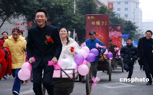 1月13日上午,一支由新郎拉著板車載著新娘的板車迎親隊(duì),浩浩蕩蕩經(jīng)過(guò)重慶梁平縣城,沿途向行人撒喜糖、紅包,然后奔向新家。這支新穎、獨(dú)特的迎親板車隊(duì),引得沿途行人駐足觀看,許多汽車主動(dòng)停下讓道,并鳴笛向他們祝賀。沿途許多市民對(duì)他們這場(chǎng)婚禮贊不絕口,送上對(duì)新人的祝福。新郎周剛介紹,新娘黃林鳳家住廣西來(lái)濱市,她愿從那么遠(yuǎn)的地方嫁過(guò)來(lái),讓他很感動(dòng),就想以一種特別的方式娶她,因此請(qǐng)人策劃了這場(chǎng)婚禮。新郎稱,租汽車需花2000元左右,租10輛板車只花了400元,用板車比汽車節(jié)約,其實(shí)節(jié)約這點(diǎn)錢對(duì)他們來(lái)說(shuō)不算什么,但主要的是這種形式終身難忘,要的是倡導(dǎo)婚事新辦節(jié)約。當(dāng)天他們向行人撒了約5公斤喜糖,撒了200個(gè)、內(nèi)裝2元錢紅包。中新社發(fā) 木文 攝