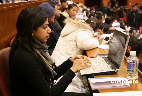 圖為印度女記者在現(xiàn)場進行采訪報道。中新社發(fā) 賈長飛 攝