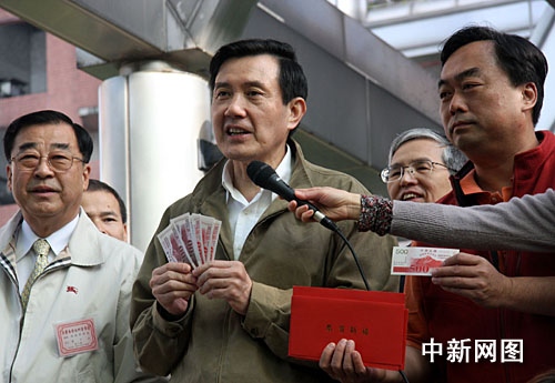 1月18日上午,備受全臺和外界關(guān)注的消費券開始在臺灣各發(fā)放所發(fā)放。圖為馬英九今天上午九時許來到臺北市第1291號消費券發(fā)放所領(lǐng)取消費券。馬英九隨后發(fā)表講話,呼吁臺灣全體民眾善用消費券,積極促進(jìn)內(nèi)需,擴大消費。陳立宇 攝