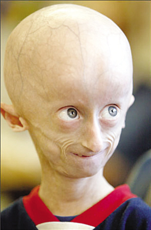 據(jù)報(bào)道,現(xiàn)年14歲的美國(guó)男孩塞斯·庫(kù)克是美國(guó)華盛頓州西雅圖附近達(dá)令頓地區(qū)人,和《返老還童》中的男主人公本杰明一樣,他出生時(shí)就沒(méi)有毛發(fā),皮下脂肪退化,皮膚血管清晰可見(jiàn),如同一名70歲老人一般衰老。當(dāng)塞斯18個(gè)月大時(shí),他被診斷出患有罕見(jiàn)的早衰癥。37歲的父親凱爾·庫(kù)克說(shuō):“一開(kāi)始我們聽(tīng)到這個(gè)消息簡(jiǎn)直驚呆了,我們不敢相信這一切!