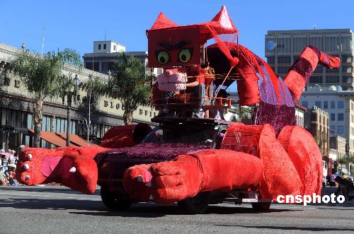 圖為巨貓花車招搖過市。中新社發(fā) 張煒 攝
