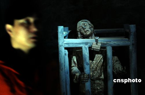 一月中旬,拉薩布達拉宮雪城監(jiān)獄展示著根據(jù)舊西藏法典而對農(nóng)奴和奴隸們施加的各種酷刑,包括挖眼、抽筋、割舌、砍手、剁腳,從高山推下摔死,用牛皮包身投入水中淹死,或者立即殺死等。中新社發(fā) 廖攀 攝