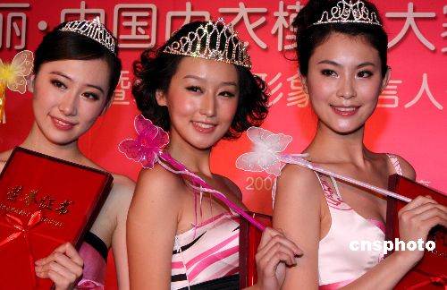 1月20日晚,2009“愛美麗中國內(nèi)衣模特大賽”啟動儀式暨 “愛美麗”形象代言人簽約儀式在北京拉開序幕,獲得2008中國內(nèi)衣模特大賽冠、亞、季軍的3位“愛美麗天使”也作為愛美麗的代言人驚艷亮相。圖為冠、亞、季軍的選手。 中新社發(fā) 錢興強(qiáng) 攝