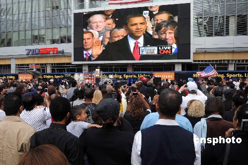 洛杉磯市民觀看奧巴馬就職。中新社發(fā) 張煒 攝