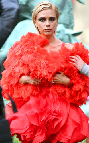 貝克漢姆的妻子維多利亞著迷于高級(jí)女式時(shí)裝,有時(shí)走到了極端。不久前參加巴黎的時(shí)裝展時(shí)穿上了紅色羽毛裙,給她苗條的身體增添了不少寬度。維多利亞變成了“火雞”形象。