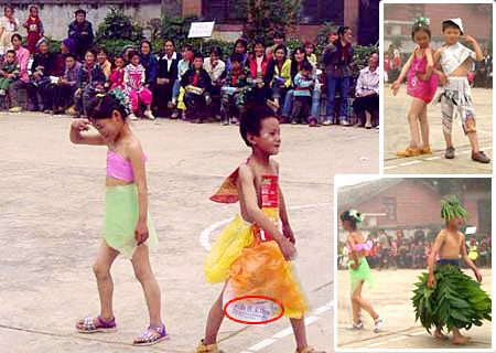 幾名小學生穿著有創(chuàng)意的服裝,利用廢舊報紙、綠葉等做成服裝道具,在一簡陋的校園操場上學著模特的貓步行走,淳樸天真的表演贏得了許多網(wǎng)友跟帖喝彩,稱“除了能宣傳環(huán)保,還能鍛煉、啟發(fā)孩子”,不過也有人并不認可。
