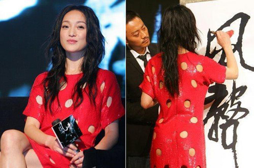 2009年1月15日,北京,電影《風(fēng)聲》的開機發(fā)布會當天舉行。周迅身著紅色“漏洞”裝亮相,演繹“透明人”明艷搶鏡。