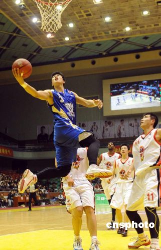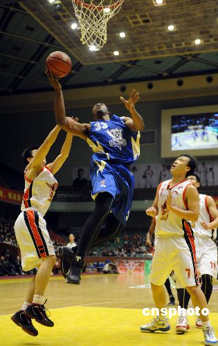 東莞馬可波羅隊球員哈里斯(中)上籃,山東隊球員王剛(左)攔截。