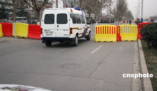 圖為當(dāng)日上午,法院用紅、黃色的塑料隔離墻代替警戒線,嚴(yán)格控制車輛出入。