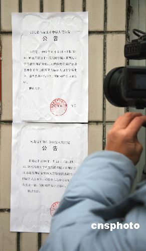 圖為法院門口張貼關(guān)于下午兩點(diǎn)開庭宣判三鹿集團(tuán)及田文華等生產(chǎn)、銷售偽劣產(chǎn)品一案和張玉軍、張彥章以危險(xiǎn)方法危害公共安全案的公告。中新社發(fā) 翟羽佳 攝