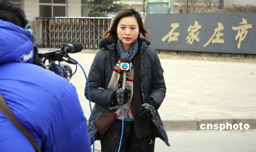 圖為當(dāng)日上午,在石家莊中級法院門口,來自香港的電視臺記者冒著寒風(fēng)做現(xiàn)場報道。中新社發(fā) 翟羽佳 攝