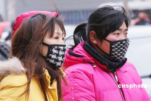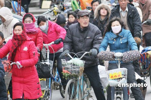 2009年1月22日,江蘇省贛榆縣市民在寒風(fēng)中出行。受強冷空氣東移南下影響,江蘇全省迎來強降溫寒潮天氣,蘇北沿海溫度最低降至零下8攝氏度以下,風(fēng)力9~10級。當(dāng)?shù)貧庀蟛块T發(fā)布寒潮黃色預(yù)警信號,并提醒有關(guān)單位和個人做好防寒保暖和防風(fēng)工作。中新社發(fā) 司偉 攝