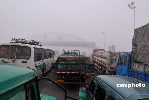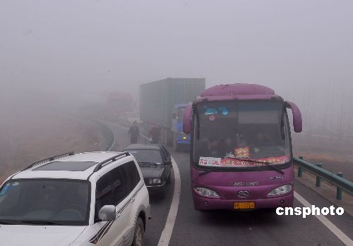 1月22日,受北方南下冷空氣與當?shù)嘏瘽駳饬鹘粎R影響,當天清晨5時左右起,安徽滁州遭受大霧襲擊,境內(nèi)寧洛、滬陜、京臺高速能見度在50至100米,嚴重影響春運期間的交通安全。大霧期間,滁州高速交警對轄區(qū)所有高速入口全部實行暫時封閉,在增派干警加大路面巡邏力度的同時,還安排警車引導車輛行駛。截至上午10時左右,濃霧逐漸散去,所有高速道口實行了間段放行。中新社發(fā) 王家國 攝
