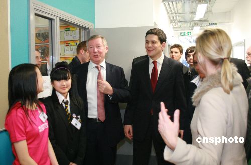 當(dāng)?shù)貢r間22日下午,英國外交大臣米利班德在曼徹斯特發(fā)布英國政府首個對華關(guān)系框架性文件后,與英超曼聯(lián)俱樂部主教練弗格森爵士一起來到斯達(dá)芒頓中學(xué),了解該校師生去年訪華的體會。圖為米利班德(左四)和弗格森(左三)與該校的華裔學(xué)生在一起。中新社發(fā) 李鵬 攝