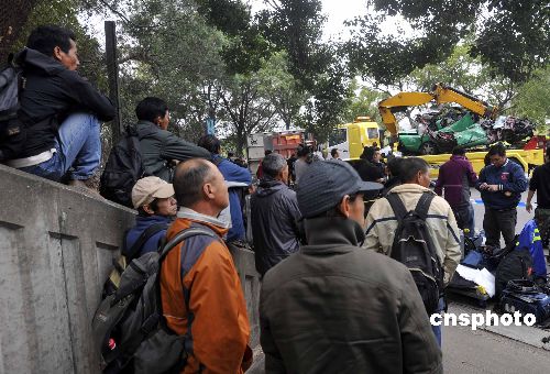 圖為死者的工友在車禍現(xiàn)場(chǎng)關(guān)注事件。中新社發(fā) 鄧慶樂(lè) 攝