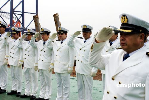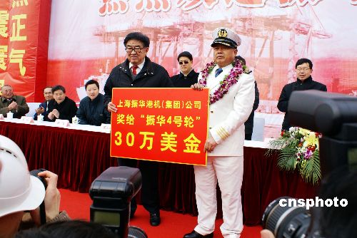 1月23日上午,上海振華港機(jī)集團(tuán)在長(zhǎng)興島基地為“振華4號(hào)”輪順利返航舉行盛大歡迎儀式,“振華4號(hào)”船長(zhǎng)彭維源帶領(lǐng)29名船員整裝首次集體亮相,并向眾媒體記者和現(xiàn)場(chǎng)來賓介紹了抗擊索馬里海盜的具體經(jīng)過。歡迎儀式現(xiàn)場(chǎng),振華港機(jī)集團(tuán)向每位船員頒發(fā)1萬美元獎(jiǎng)金,并授予船長(zhǎng)“振華功臣金質(zhì)獎(jiǎng)?wù)隆。北京時(shí)間2008年12月17日中午,中國交通建設(shè)集團(tuán)所屬“振華4號(hào)”輪在途徑亞丁灣水域時(shí)遭遇2艘海盜船襲擊,有9名海盜登船,持沖鋒槍和火箭筒在甲板上與我船員對(duì)峙,我船上的30名船員用高壓水槍和自制燃燒彈自衛(wèi)并反擊。海盜在隨后趕來的國際救援軍艦直升機(jī)的威懾下,終于放棄攻擊,狼狽逃竄。中新社發(fā) 李根 攝