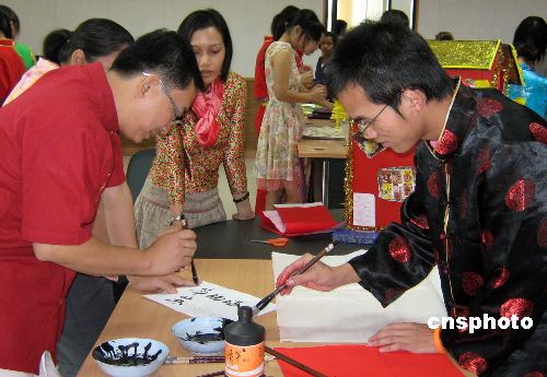 1月25日,中國(guó)農(nóng)歷大年三十。由中國(guó)廣西大學(xué)與泰國(guó)川登喜皇家大學(xué)合辦的泰國(guó)素攀孔子學(xué)院舉行了2009年迎新春文藝及游園會(huì),素攀孔子學(xué)院院長(zhǎng)郭宇路(左一)教泰國(guó)師生練習(xí)中國(guó)書法。中新社發(fā) 譚淑玲 攝