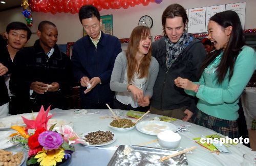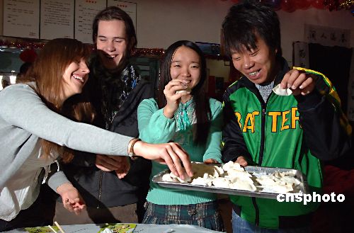 1月25日,農(nóng)歷大年三十。北京語(yǔ)言大學(xué)寒假留校的中國(guó)大學(xué)生與來(lái)自10個(gè)國(guó)家的40余名外國(guó)留學(xué)生、地震災(zāi)區(qū)的大學(xué)生歡聚一堂共慶新春。 中新社發(fā) 鄒憲 攝