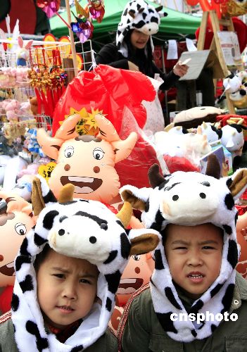 一月二十五日是中國農(nóng)歷大年三十,一對(duì)雙胞胎兄弟在香港年貨市場(chǎng)上頭戴卡通牛,惹人喜愛。中新社發(fā) 張勤 攝