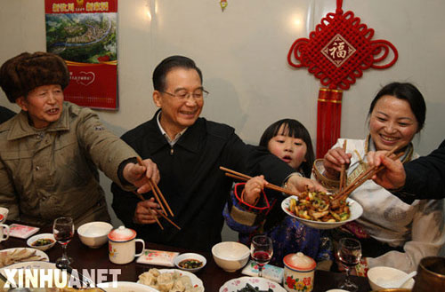 1月25日,溫家寶總理在汶川映秀鎮(zhèn)板房安置小區(qū)吳志遠(yuǎn)家吃年夜飯。這是溫家寶請大家品嘗他剛炒出的回鍋肉。1月24日至25日,中共中央政治局常委、國務(wù)院總理溫家寶來到四川受災(zāi)最為嚴(yán)重的北川、德陽、汶川等地,和災(zāi)區(qū)人民一起過年。作者:姚大偉