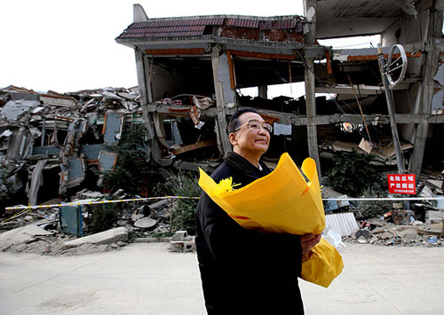 1月24日至25日,中共中央政治局常委、國(guó)務(wù)院總理溫家寶來(lái)到四川受災(zāi)最為嚴(yán)重的北川、德陽(yáng)、汶川等地,和災(zāi)區(qū)人民一起過(guò)年。這是1月24日,溫家寶專(zhuān)程來(lái)到北川縣城遺址向大地震中遇難的同胞們獻(xiàn)花。作者:姚大偉