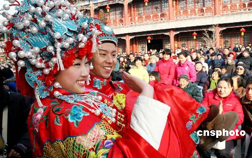 1月27日 (大年初二),北京大觀園十四屆紅樓廟會(huì)吸引眾多假日游客,本屆廟會(huì)以弘揚(yáng)中華傳統(tǒng)文化為宗旨,以展現(xiàn)紅樓文化為主題,呈現(xiàn)出改革開放30年來新北京、新宣武的精神風(fēng)貌。廟會(huì)主要活動(dòng)有“元妃省親”、“寶黛成婚”“賈母賀壽”、紅樓文化展覽--木版年畫展、紅樓夢(mèng)人物火花展以及紅樓美食展示區(qū)等。圖為在北京大觀園2009年紅樓廟會(huì)上別具創(chuàng)意的“寶黛成婚”。中新社發(fā) 錢興強(qiáng) 攝
