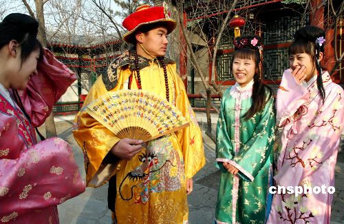 1月27日 (大年初二),北京大觀園十四屆紅樓廟會(huì)吸引眾多假日游客,本屆廟會(huì)以弘揚(yáng)中華傳統(tǒng)文化為宗旨,以展現(xiàn)紅樓文化為主題,呈現(xiàn)出改革開放30年來新北京、新宣武的精神風(fēng)貌。廟會(huì)主要活動(dòng)有“元妃省親”、“寶黛成婚”“賈母賀壽”、紅樓文化展覽--木版年畫展、紅樓夢(mèng)人物火花展以及紅樓美食展示區(qū)等。圖為在紅樓廟會(huì)上一位扮成“皇上”的游客與紅樓十二釵談笑風(fēng)聲。中新社發(fā) 錢興強(qiáng) 攝